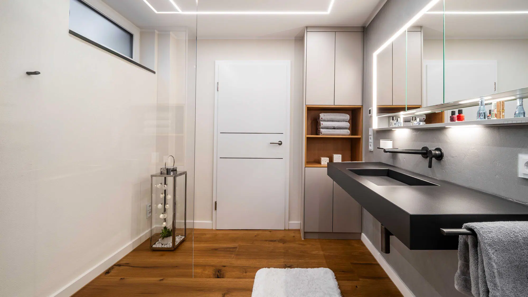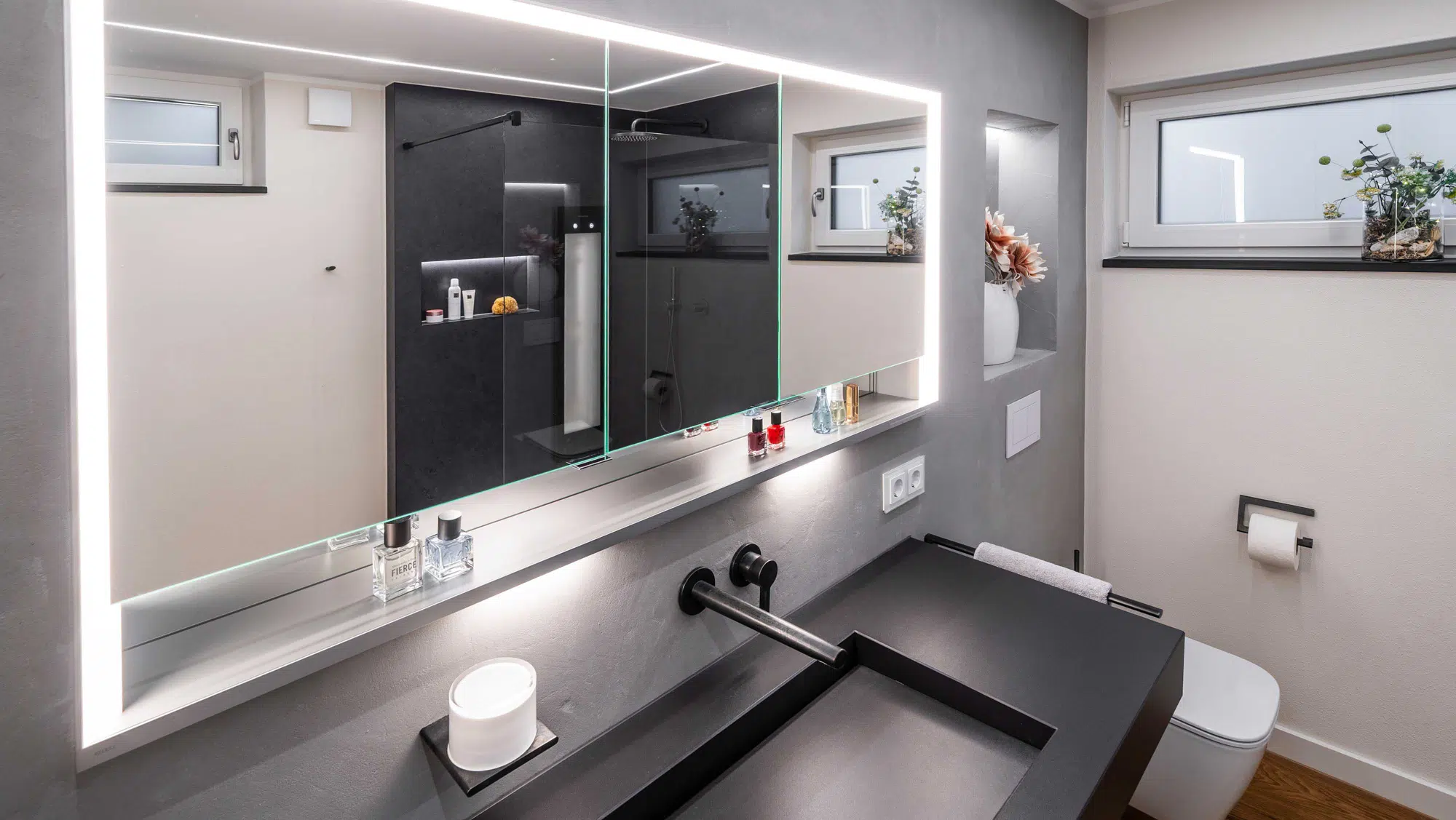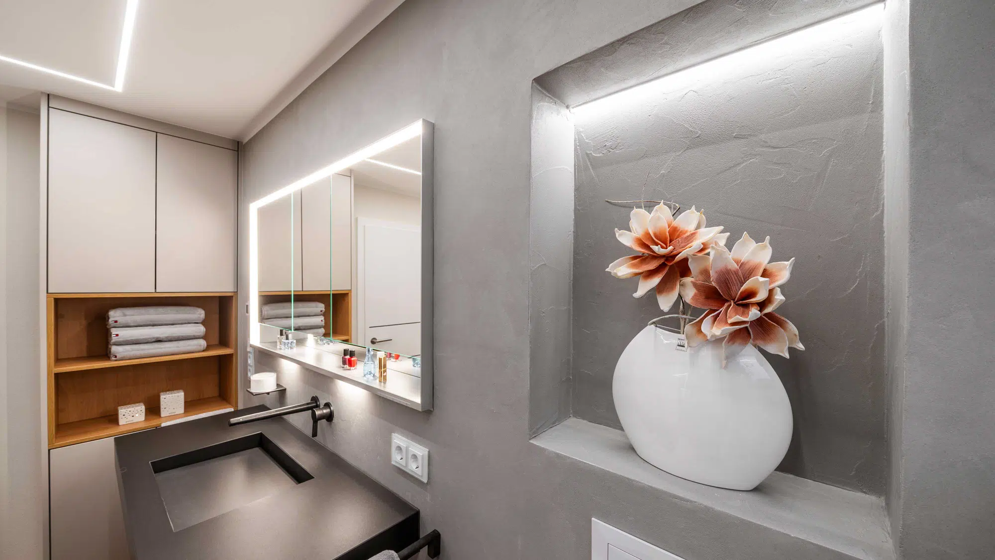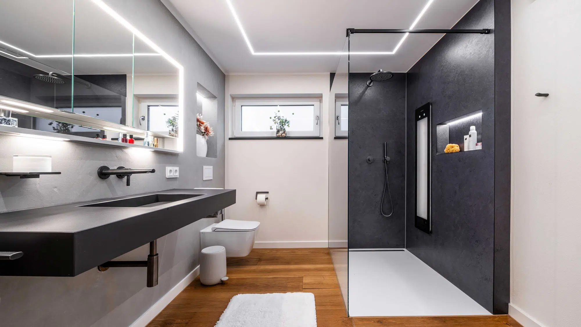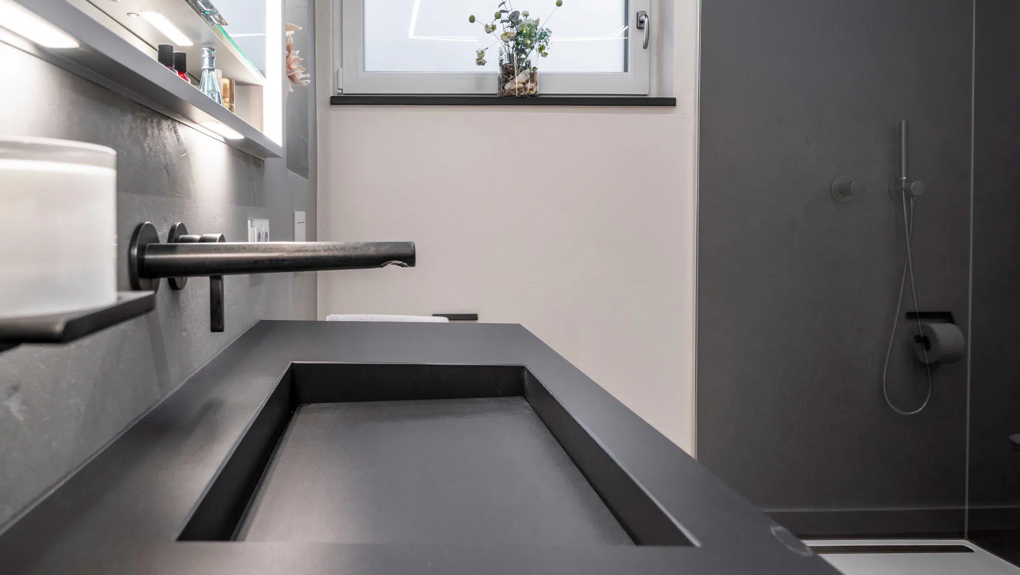 Eine fugenlose Platte schafft eine ruhige, pflegeleichte Fläche. Der Vorwandbau mit integriertem Spiegelschrank und Nischen sorgt für Stauraum und klare Ordnung. Armaturen in Sonderfarbe setzen gezielte Akzente, während die indirekte Deckenbeleuchtung dem Raum eine angenehme, gleichmäßige Atmosphäre verleiht.