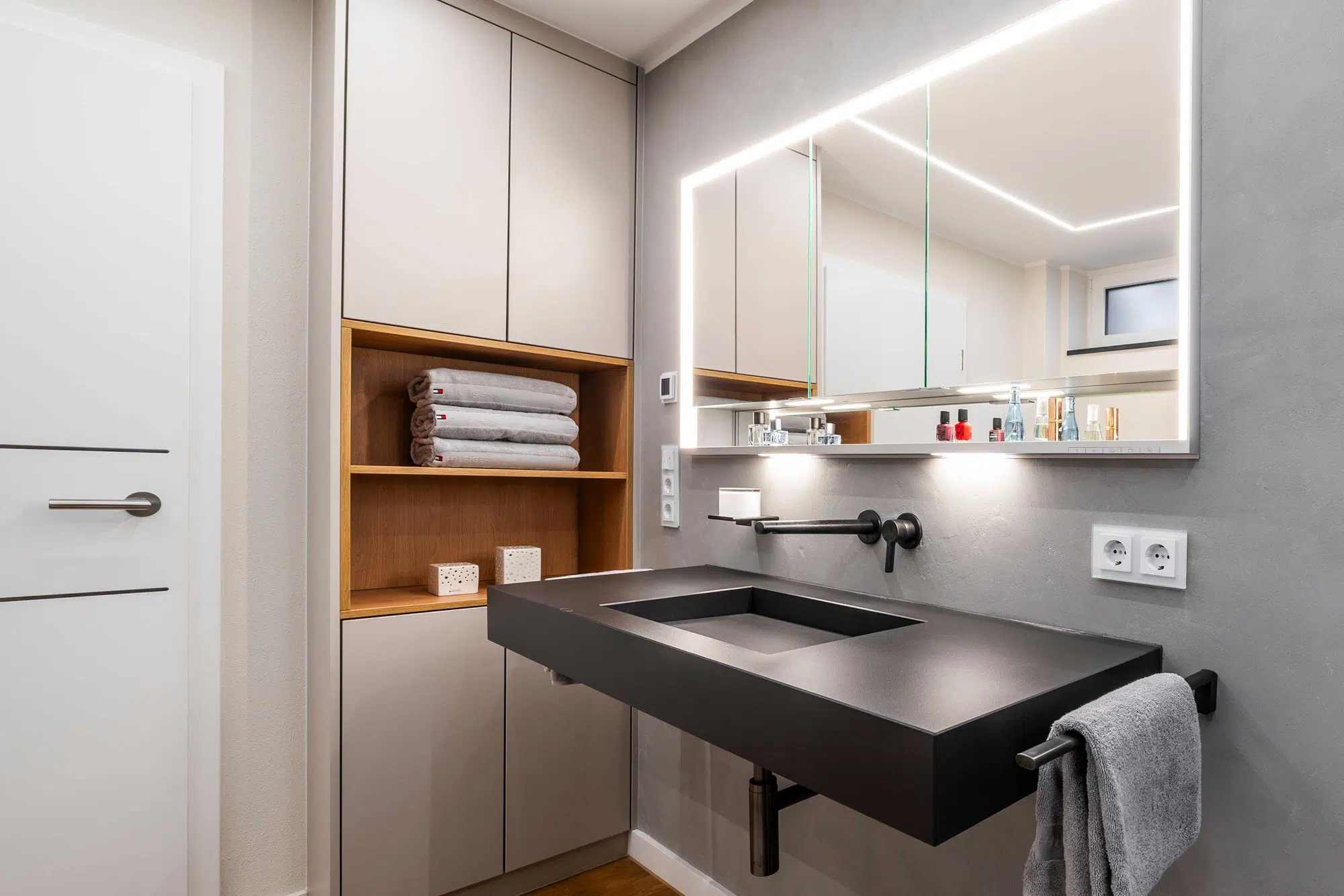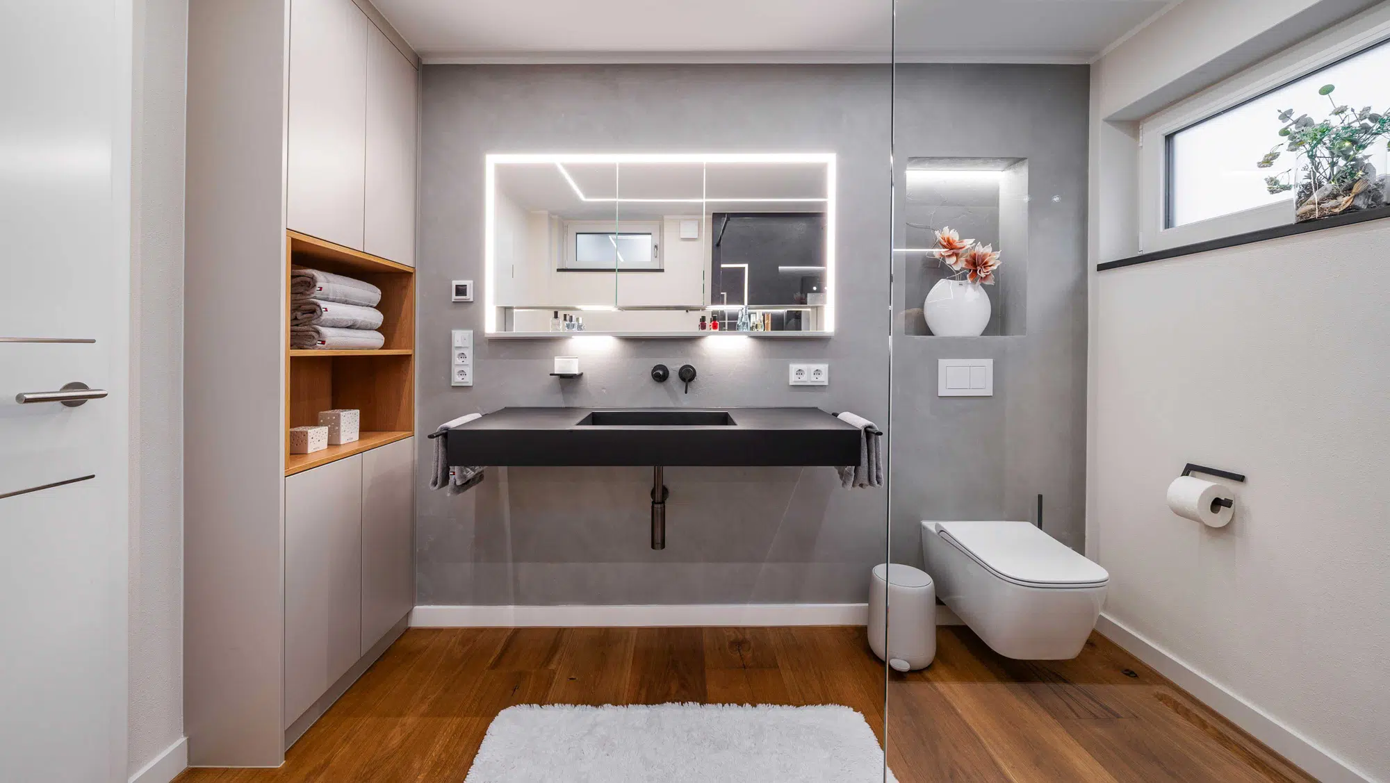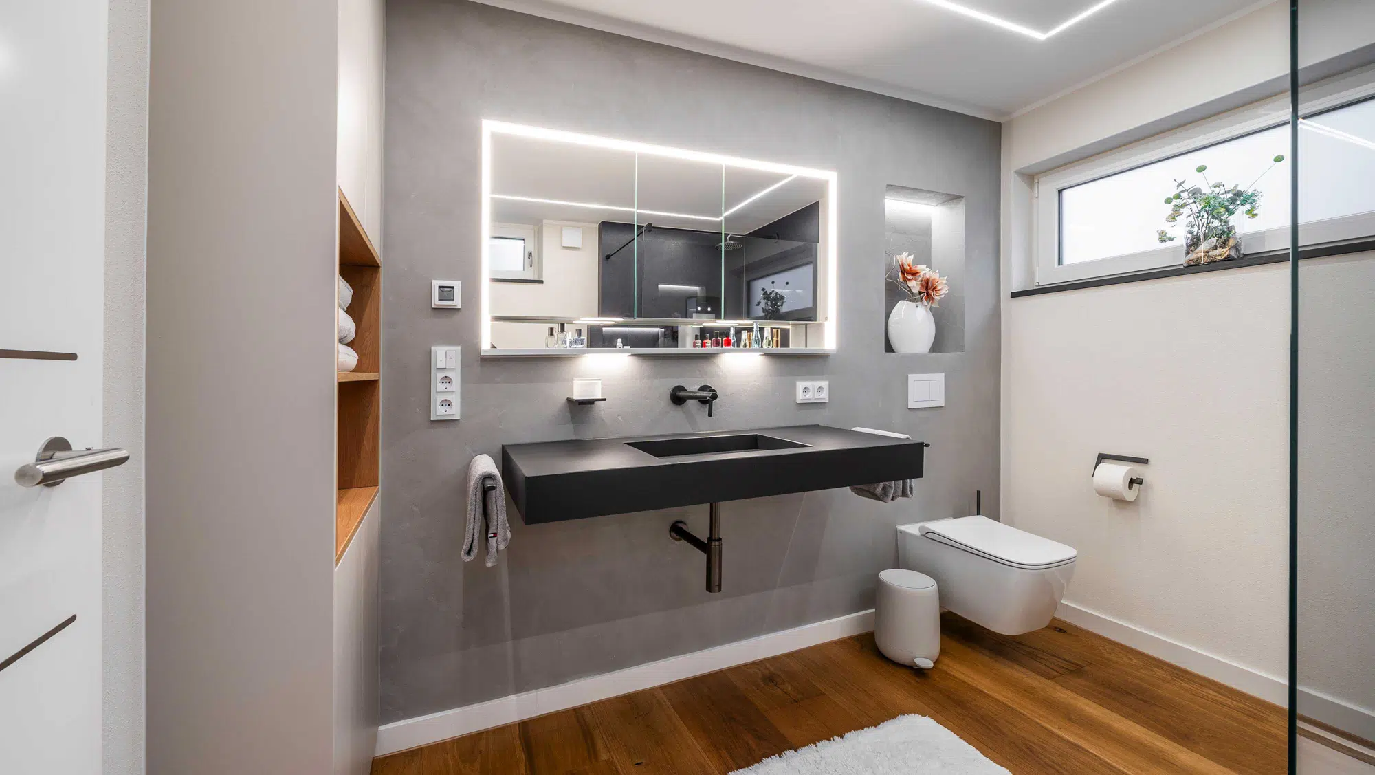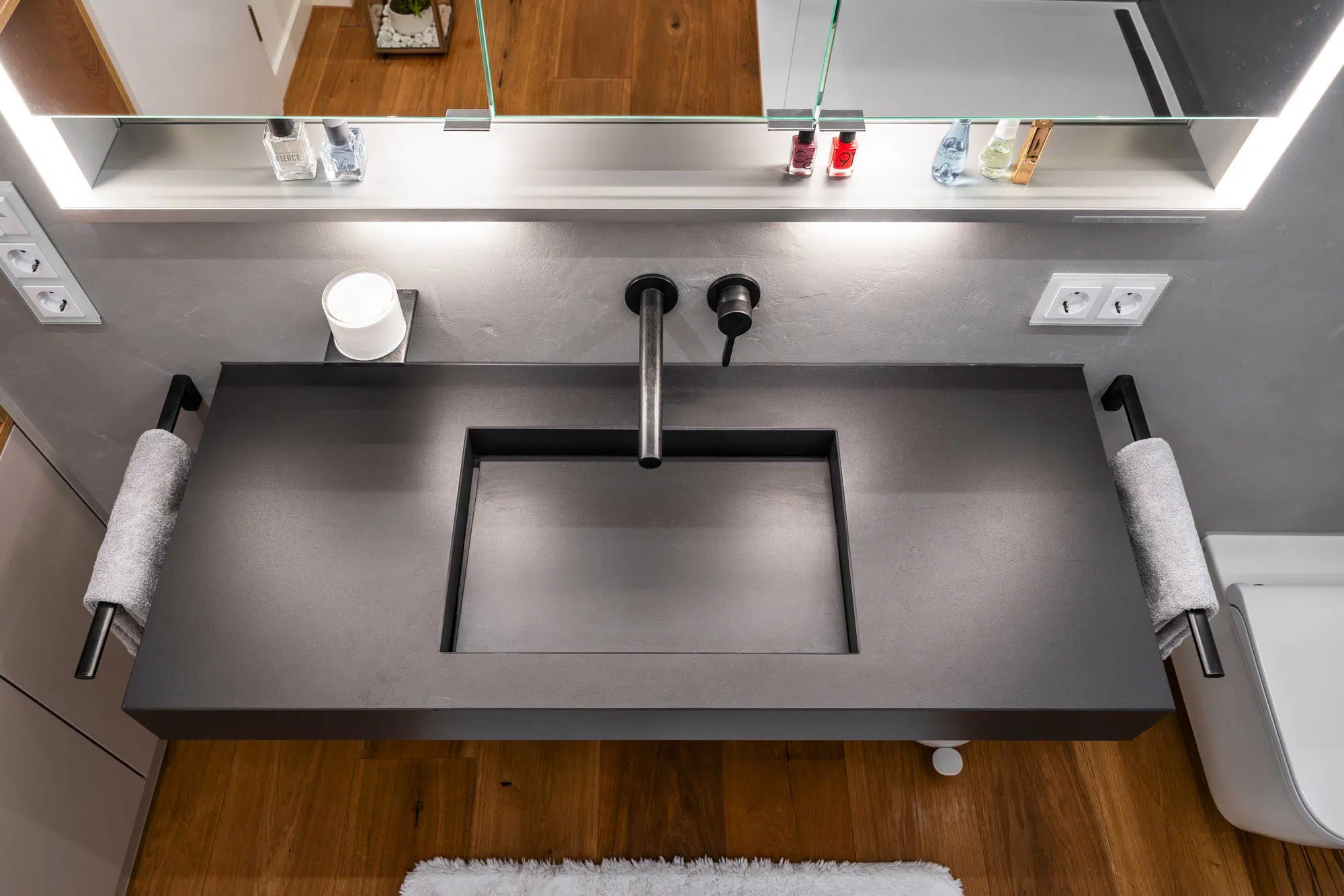 Eine fugenlose Platte schafft eine ruhige, pflegeleichte Fläche. Der Vorwandbau mit integriertem Spiegelschrank und Nischen sorgt für Stauraum und klare Ordnung. Armaturen in Sonderfarbe setzen gezielte Akzente, während die indirekte Deckenbeleuchtung dem Raum eine angenehme, gleichmäßige Atmosphäre verleiht.