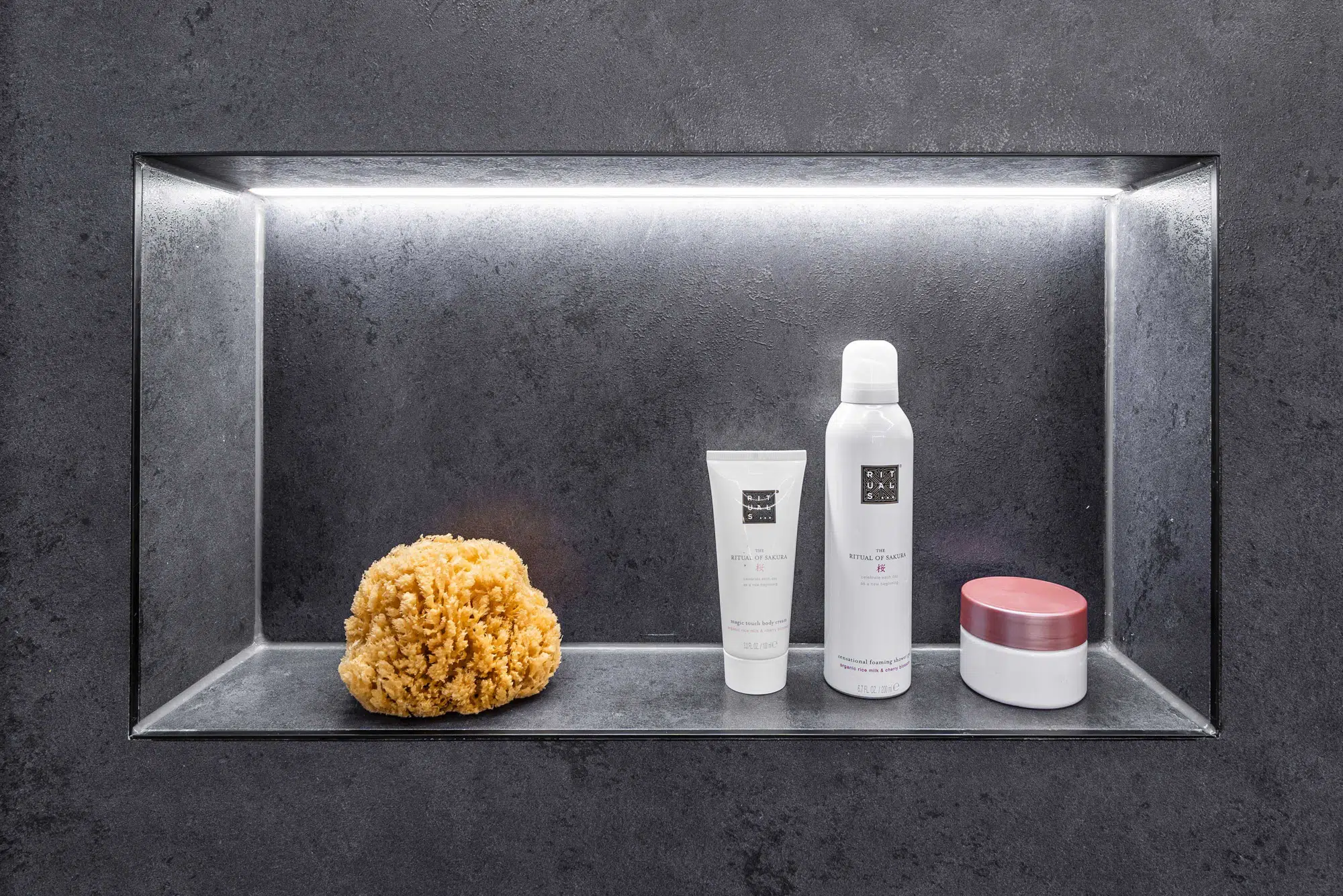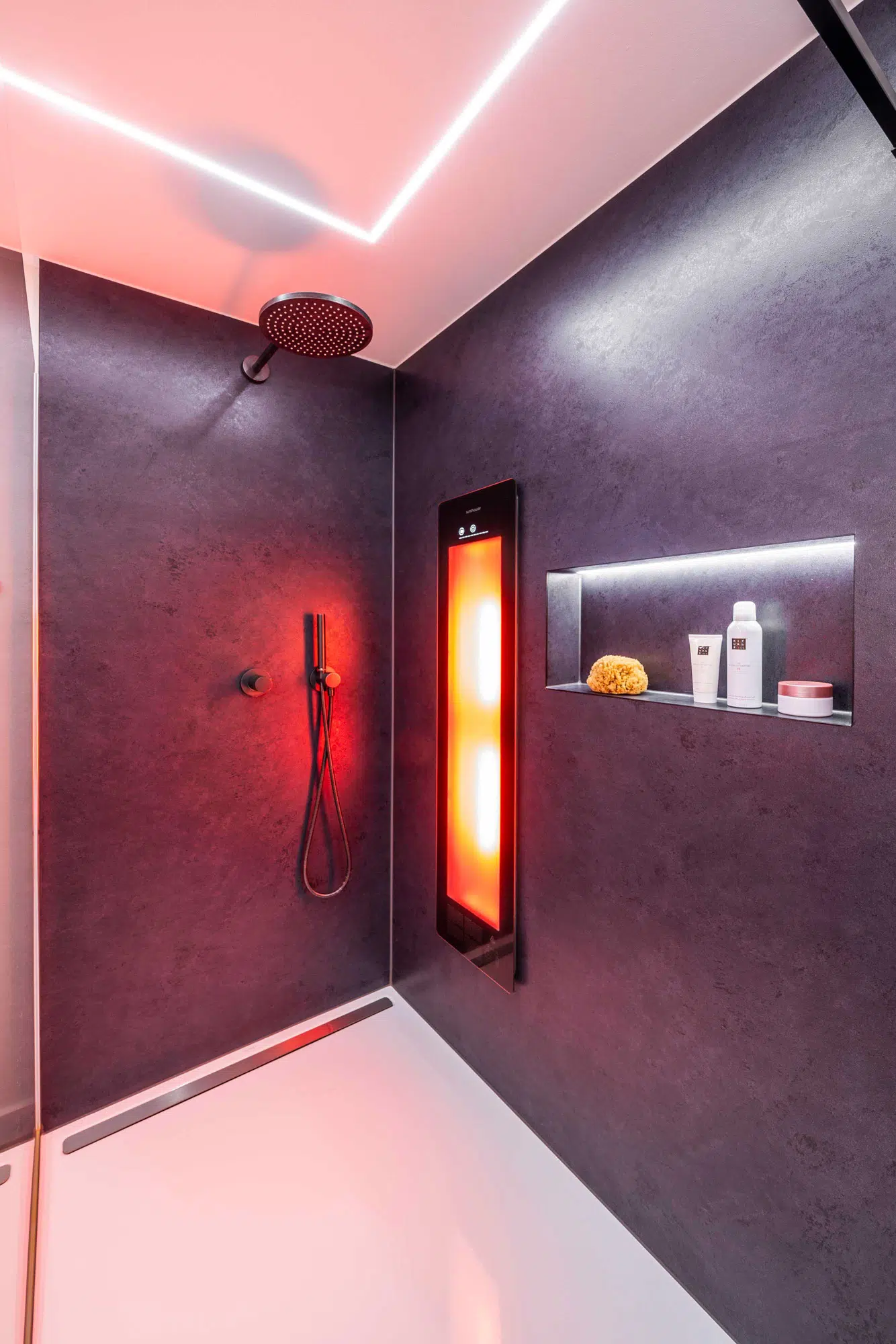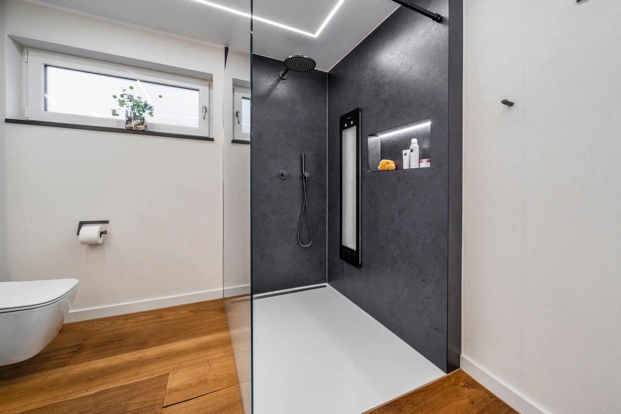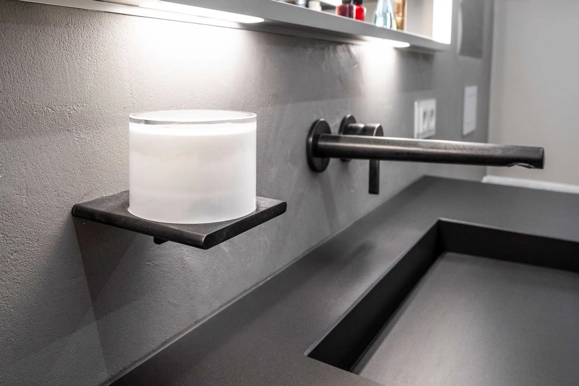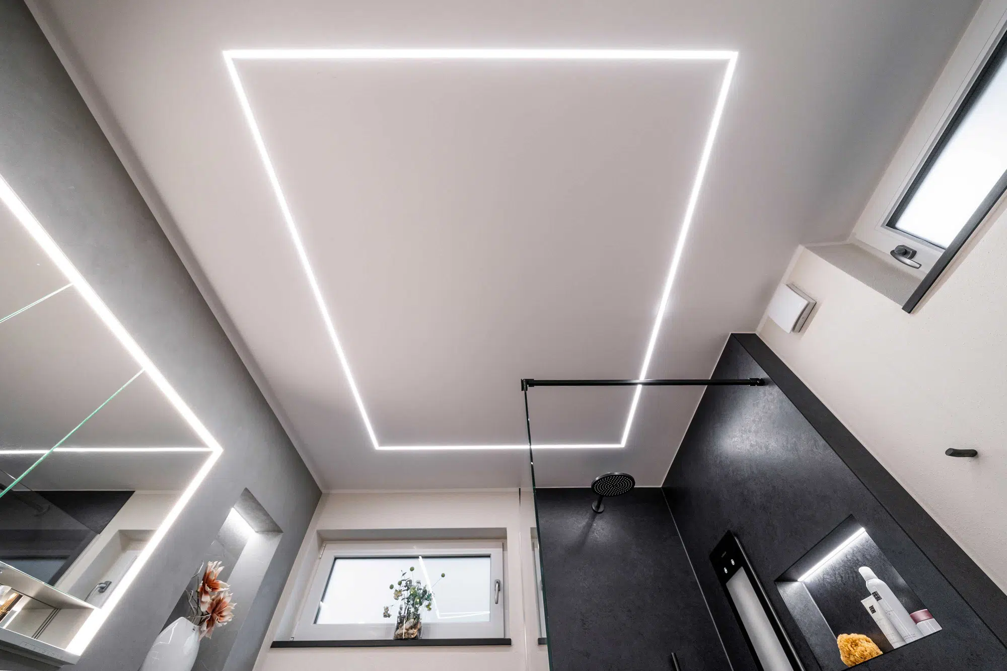 Eine fugenlose Platte schafft eine ruhige, pflegeleichte Fläche. Der Vorwandbau mit integriertem Spiegelschrank und Nischen sorgt für Stauraum und klare Ordnung. Armaturen in Sonderfarbe setzen gezielte Akzente, während die indirekte Deckenbeleuchtung dem Raum eine angenehme, gleichmäßige Atmosphäre verleiht.